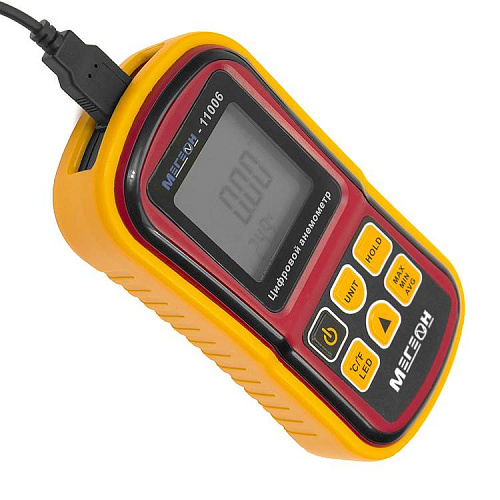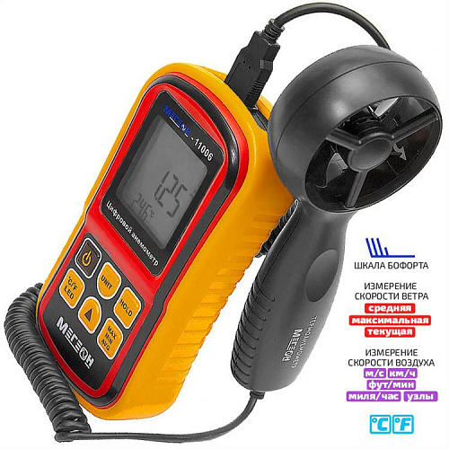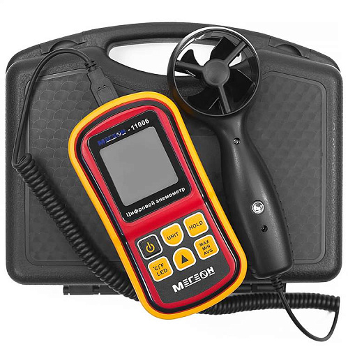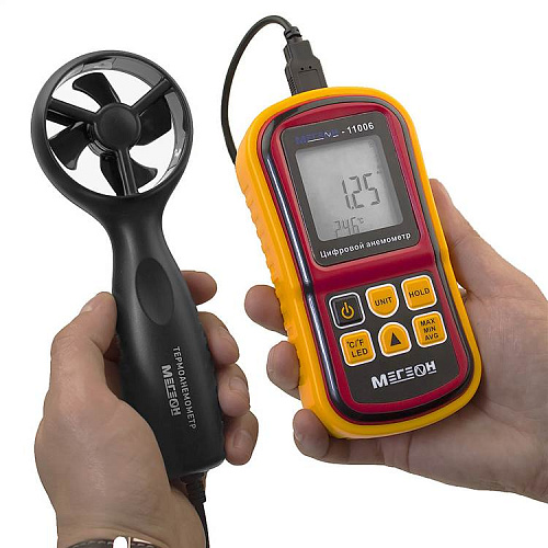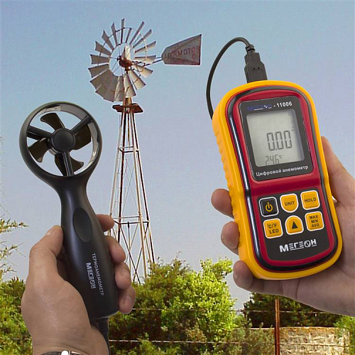 Торговая марка МЕГЕОН представляет Вашему вниманию новую модель цифрового крыльчатого анемометра, а именно МЕГЕОН 11006. Из главных отличительных особенностей данной модели стоит отметить возможность быстрого выбора единиц измерения скорости и температуры. Анемометр МЕГЕОН 11006 оснащен выносным измерительным зондом, что позволяет производить измерение параметров температуры и скорости проходящего потока воздуха даже в труднодоступных местах. Вы можете закрепить прибор на штативе (дополнительная опция) для проведения измерения в максимально комфортных условиях. Благодаря использованию современных легких материалов, крыльчатка анемометра оказывает минимальное сопротивление проходящему воздуху, что в свою очередь гарантирует минимальную погрешность при измерениях. Прибор изготовлен из высококачественных компонентов, позволяя получать максимально точные результаты измерений, а также обеспечить максимальный срок службы прибора. Благодаря дисплею с интегрированной подсветкой, Вы можете использовать прибор даже в плохосвещенных помещениях.
