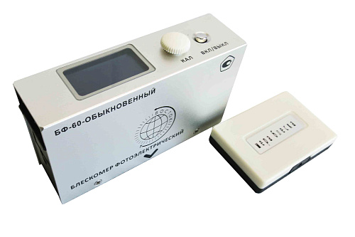 Блескомер модификации БФ-60-ОБЫКНОВЕННЫЙ предназначен для измерений блеска в геометрии освещения/наблюдения 60°/60°. Размер измеряемого участка не более 8x16 мм (эллипс). Калибровка показаний по установочной (настроечной) мере блеска поверхности производится вращением соответствующего регулятора. Результаты измерений, а также заданные режимы работы выводятся на жидкокристаллический дисплей 36x19 мм.