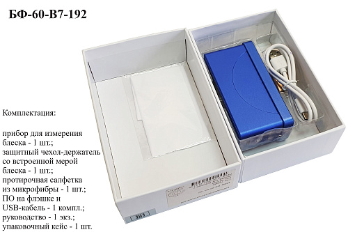 Блескомер модификации БФ-60-В7-192 предназначен для измерений блеска в геометрии освещения/наблюдения 60°/60°. Размер измеряемого участка не более 9x15 мм (эллипс). Встроенное программное обеспечение осуществляет калибровку показаний по установочной (настроечной) мере блеска поверхности (вмонтирована внутрь крышки защитного чехла-держателя), обеспечивает возможность передачи и работы с данными на внешнем ПК. Результаты измерений, а также заданные режимы работы выводятся на жидкокристаллический дисплей 47x19 мм.