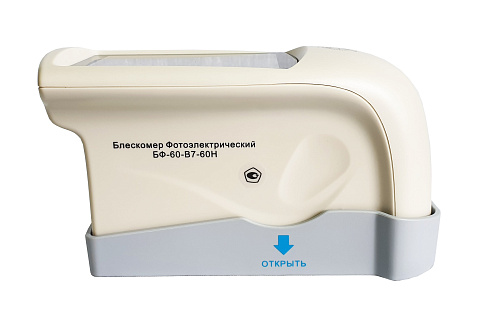 Блескомер модификации БФ-60-В7-60Н предназначен для измерений блеска в геометрии освещения/наблюдения 60°/60°. Размер измеряемого участка не более 9x15 мм (эллипс). Встроенное программное обеспечение осуществляет калибровку показаний по установочной (настроечной) мере блеска поверхности (вмонтирована внутрь крышки защитного чехла-держателя). Встроенное ПО осуществляет хранение до 1000 результатов измерений, обеспечивает возможность передачи и работы с данными на внешнем ПК. Результаты измерений, а также заданные режимы работы выводятся на цветной сенсорный жидкокристаллический дисплей 74x49 мм.