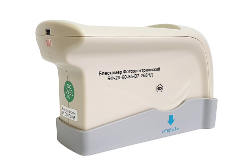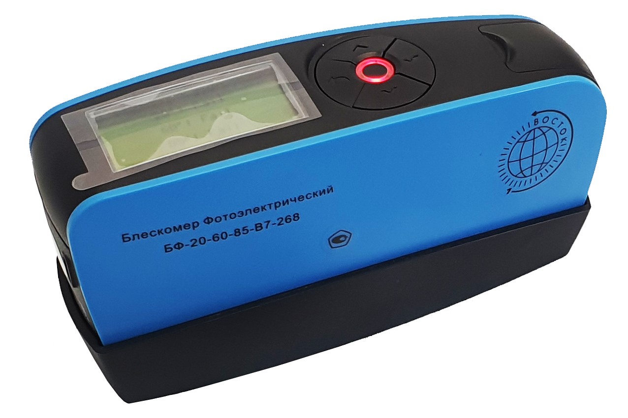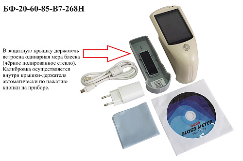 Блескомеры модификации БФ-20-60-85-В7-268НД предназначен для измерений блеска в геометриях освещения/наблюдения 20°/20°, размер измеряемого участка не более 10х10 мм (круг); 60°/60°, размер измеряемого участка не более 9х15 мм (эллипс); 85°/85°, размер измеряемого участка не более 5х36 мм (эллипс). Встроенное программное обеспечение осуществляет калибровку показаний по установочной (настроечной) мере блеска поверхности (вмонтирована внутрь крышки защитного чехла-держателя). Встроенное ПО осуществляет хранение до 5000 результатов измерений, обеспечивает возможность передачи и работы с данными на внешнем ПК. Результаты измерений, а также заданные режимы работы выводятся на цветной сенсорный жидкокристаллический дисплей 74х49 мм.