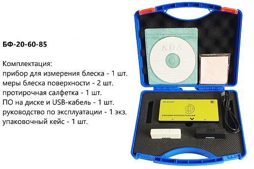 Прибор измеряет блеск на плоских поверхностях с возможностью связи с компьютером для передачи данных статистики, печати и анализа данных через USB-кабель и ПО. Программное обеспечение позволяет производить вычисление статистики из серии измерений: max и min значения, среднее значение, среднеквадратическое отклонение (σ). Режимы замеров: одиночный (моментальный в одной точке) и множественный (до 10 точек с расчётом среднего арифметического и среднеквадратического из серии измерений). Поставляется в комплекте с двумя отдельными мерами блеска (из белой керамики и чёрного кварца – мориона). Самостоятельная калибровка блескомера пользователем возможна только на мере блеска из комплектации прибора. Прибор изготавливается в прочном алюминиевом корпусе: стойкий к ударам, коррозии, легко очищается от производственной грязи и запылений.