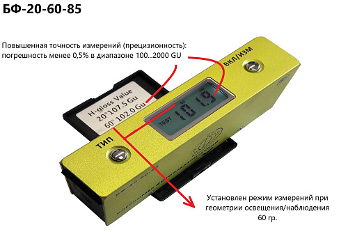 Специфика - для измерения плоской поверхности со средним уровнем блеска (полуматовые и полуглянцевые поверхности, в т. ч. пластики и полимеры по ISO 2813) с повышенной точностью (прецизионностью) в диапазоне 100…2000 GU погрешность менее 0,5%: лакокрасочные поверхности в автомобилестроении, электронной и музыкальной инструментальной промышленности; строительная индустрия: мрамор, гранит, керамическая плитка, твёрдые половые и декоративные покрытия; полиграфическая промышленность: типографские чернила и краски, бумага и обёрточные материалы; металлургическая промышленность: твёрдотянутые (неотожжённые) алюминиевые сплавы.