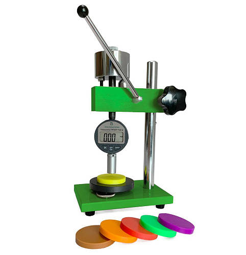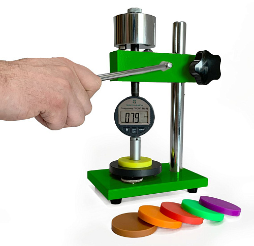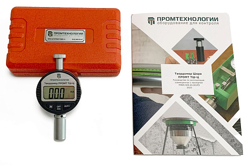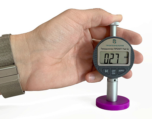 Это простой и надежный цифровой прибор из ударопрочного ABC пластика с LCD дисплеем, кнопками установки нуля и фиксации полученного значения, а также удлиненной контактной площадкой облегчающей применение дюрометра. Внутри устройства установлена тарированная пружина обеспечивающая требуемое усилие на индентор специальной формы из закаленной стали и механизм фиксации его перемещения. Для проведения измерения в соответствии с ГОСТ также потребуется секундомер и термометр. Твердомер Шора ПРОМТ ТШ-Ц (тип А) не требует специальных навыков для работы с ним и позволяет оперативно контролировать твердость мягких резины и пластиков, силикона, винила и аналогичных материалов в лабораторных и цеховых условиях.